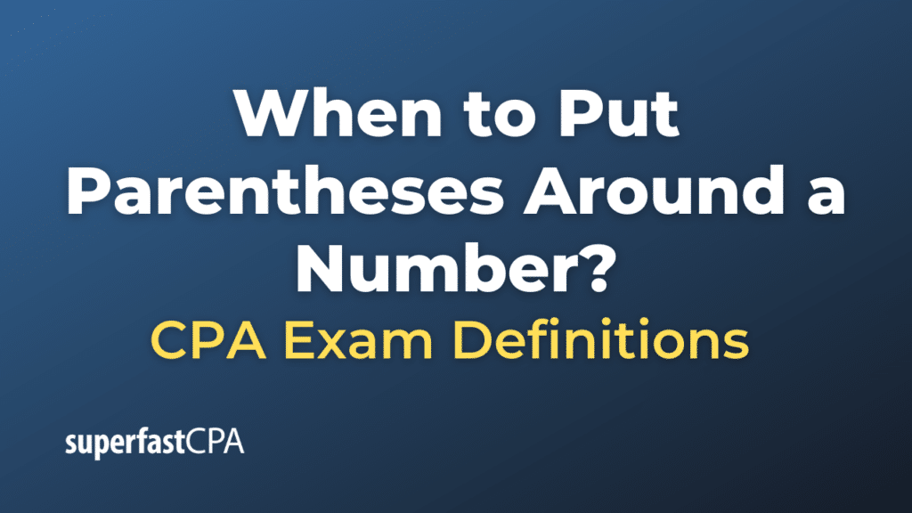 In accounting, parentheses are commonly used to indicate negative amounts, typically for variables that have decreased in value or represent losses or liabilities. Using parentheses to indicate negative numbers is a widely accepted format in financial reporting and is often considered easier to read than using a minus sign. Here are some specific cases where parentheses may be used around numbers in accounting: